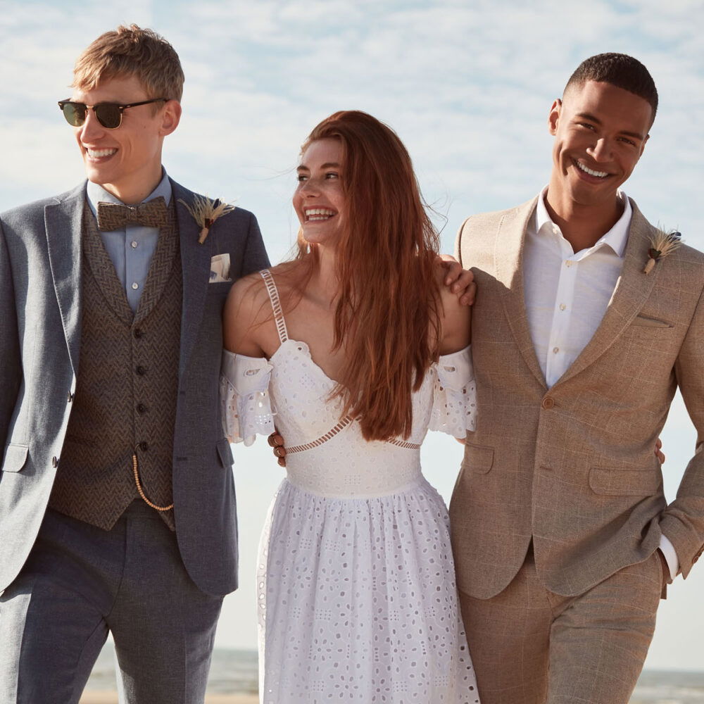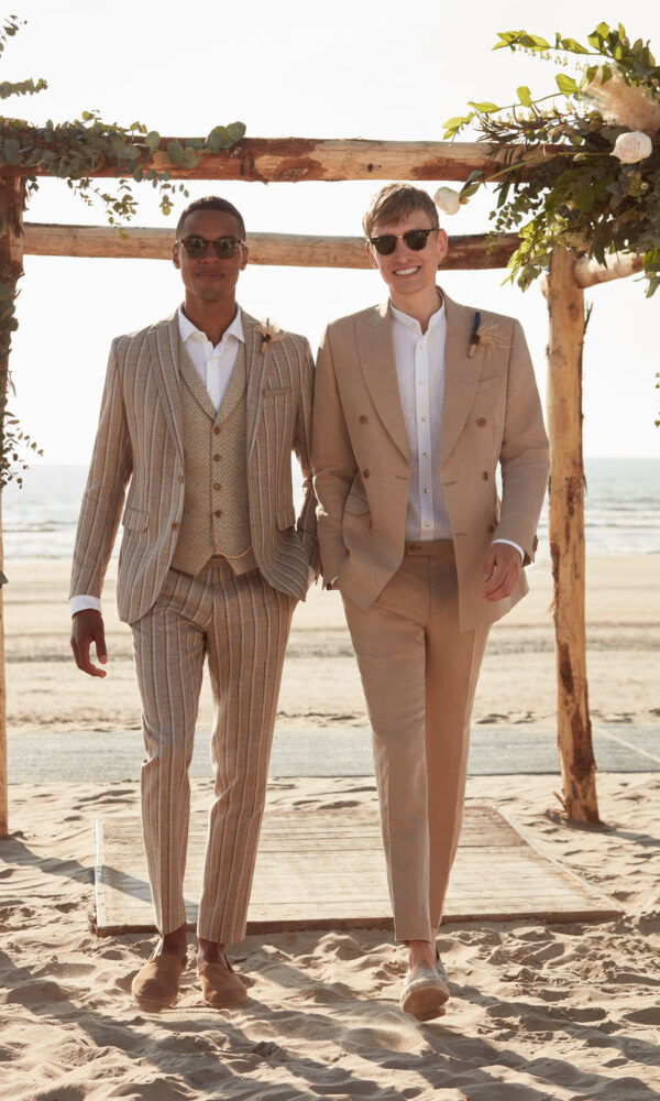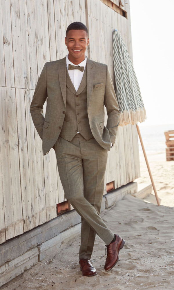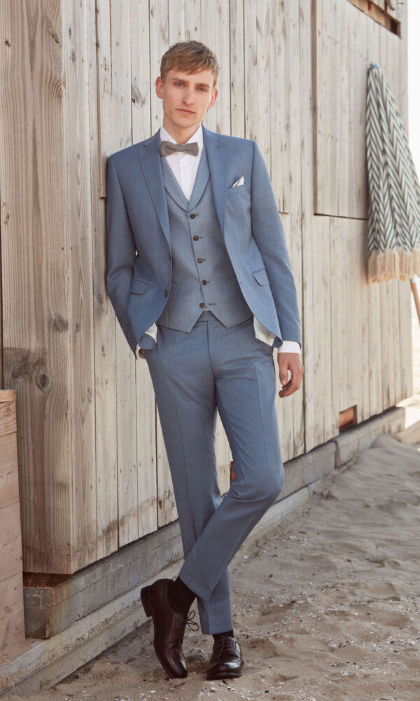 Die Anzüge der Sommersaison bewegen sich farblich von beige, über hellblau und hellgrau bis hin zu dunkelblau. Die Natürlichkeit der Farben und Stoffe unterstreichen die edle und lässige Romantik der Umgebung und passen sich dabei dem Look der Braut an. Belebt wird die Kollektion durch mannigfaltige Mustervariationen, von feinen Mustern, über Streifen bis hin zu Fensterkaros. Komplettiert wird das Outfit durch die passende Paperboy Cap und Espadrilles im Oberstoff des Anzugs. Der Style wirkt harmonisch und entspannt, nie overdressed.