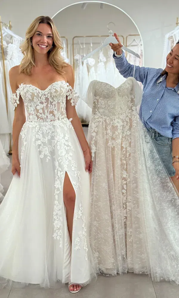 Mit im Store ist auch unser Model Cindy, das beide Kleider – das Original des Herstellers und die veränderte Variation – einfach mal anprobiert. Cindy: „Ich bin begeistert über die vielen Möglichkeiten – ich wusste nicht, dass maßgeschneiderte Brautkleider so flexibel anpassbar sind!“