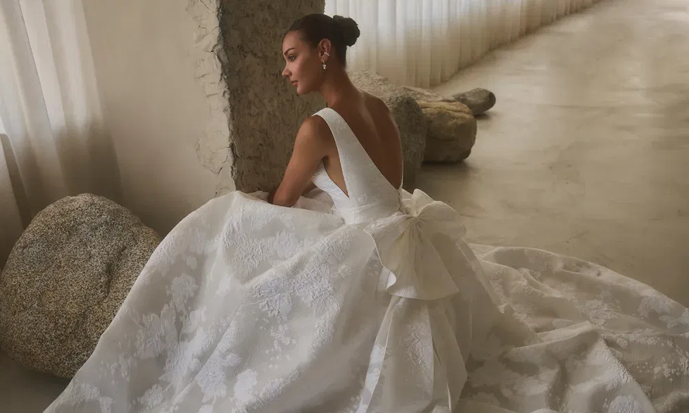 … trifft auf klassische Eleganz: Ein tiefes Rückendekolleté und eine markante Schleife machen dieses Hochzeitskleid zu einem modernen Couture-Erlebnis.
