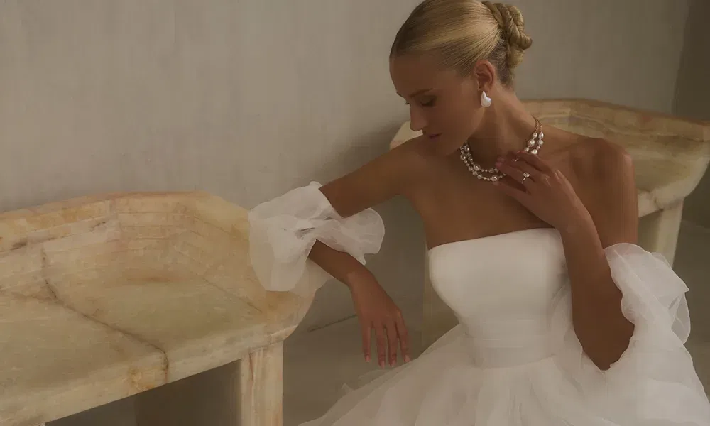 Dieses Hochzeitskleid von Casablanca besticht durch ein cleanes Corsagen-Oberteil und voluminöse, abnehmbare Tüllärmel – perfekt ergänzt durch eine Perlenkette und skulpturale Ohrringe.