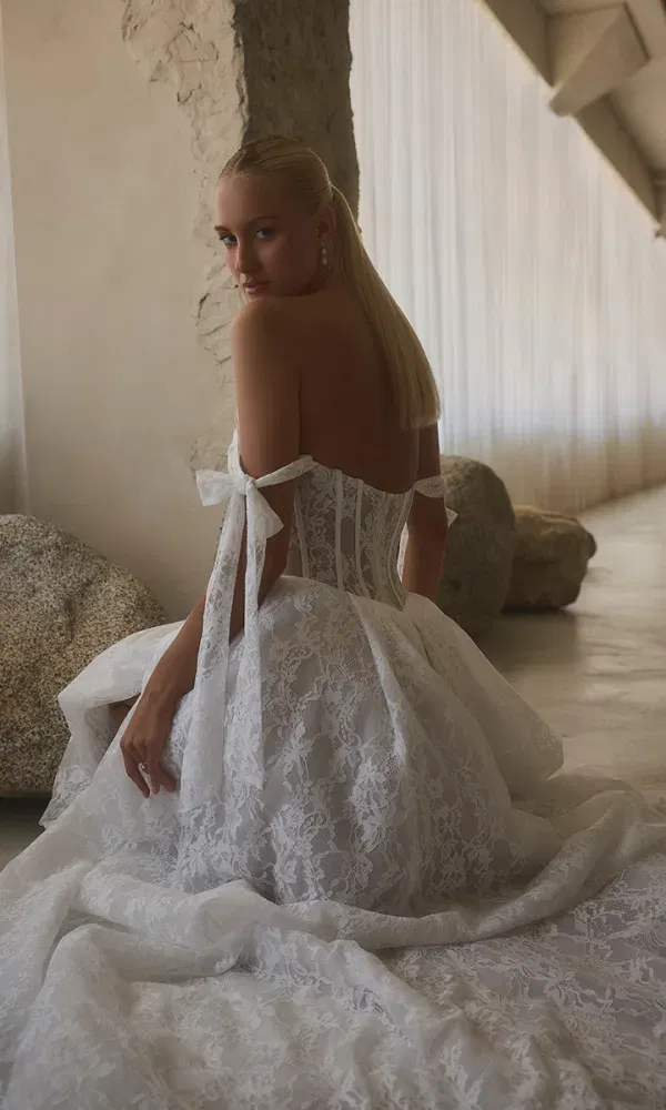 Das semi-transparente Corsagen-Oberteil mit Schnürdetails und Schleifenärmeln verleiht diesem romantischen Look eine moderne Note – ein echter Favorit unter den Casablanca Hochzeitskleidern.