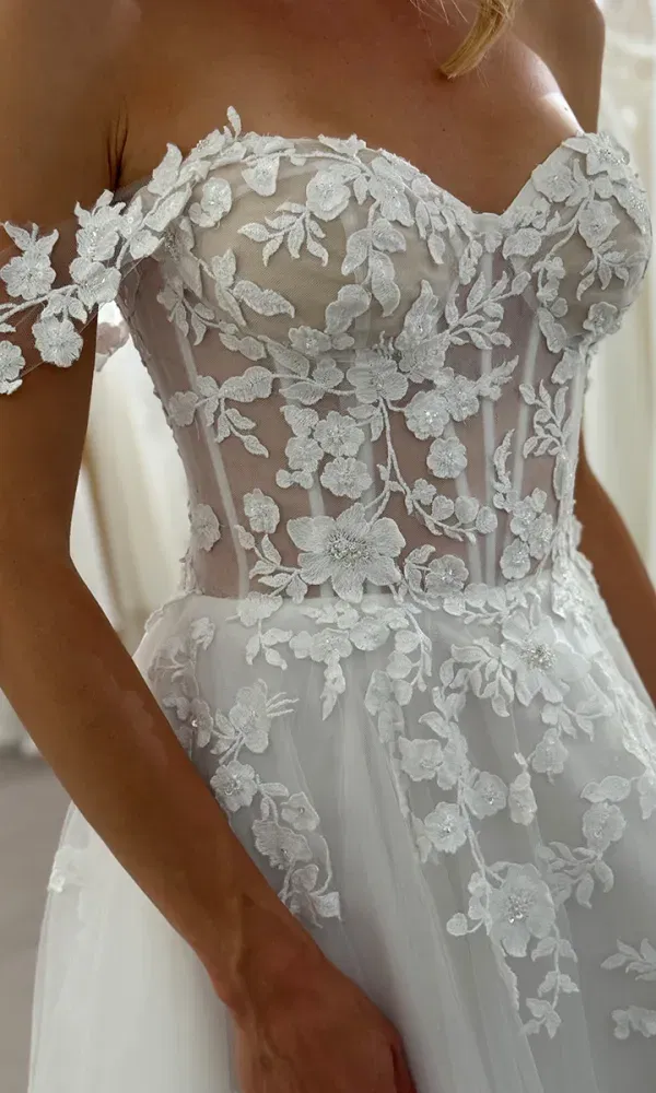 So sieht das Casablanca Brautkleid Mae im Original aus: Eine Spitzenrobe mit leichten Tüllärmeln im Carmen-Style – zeitlose Eleganz für deine Hochzeit.