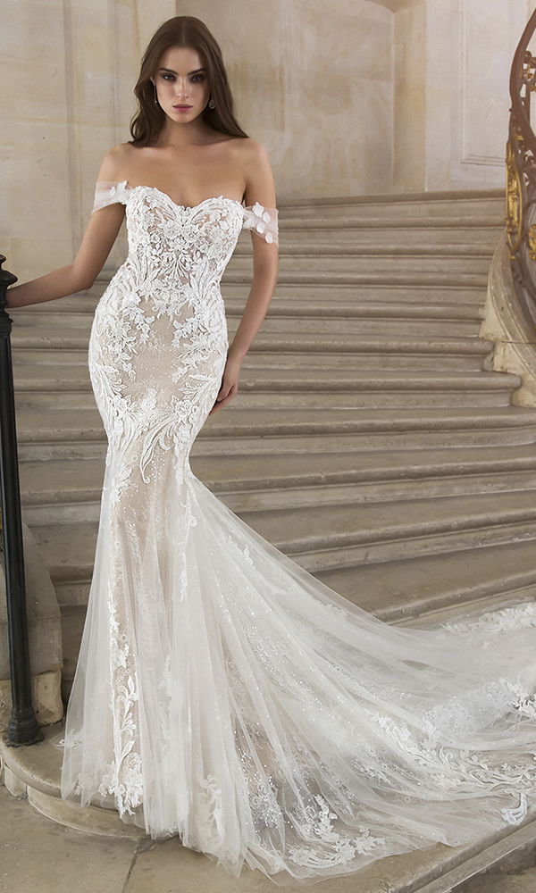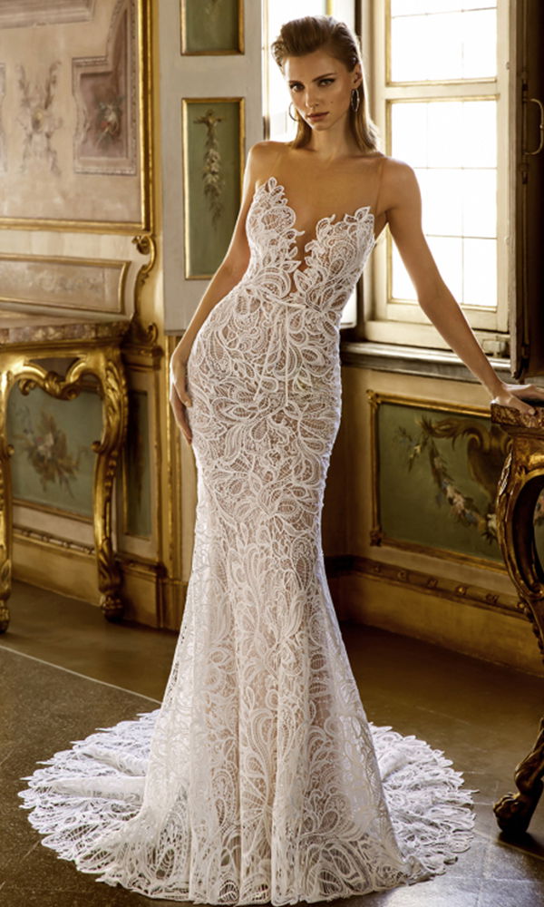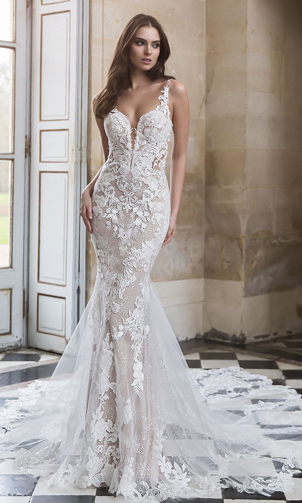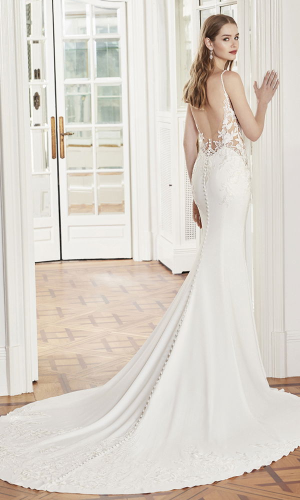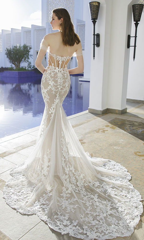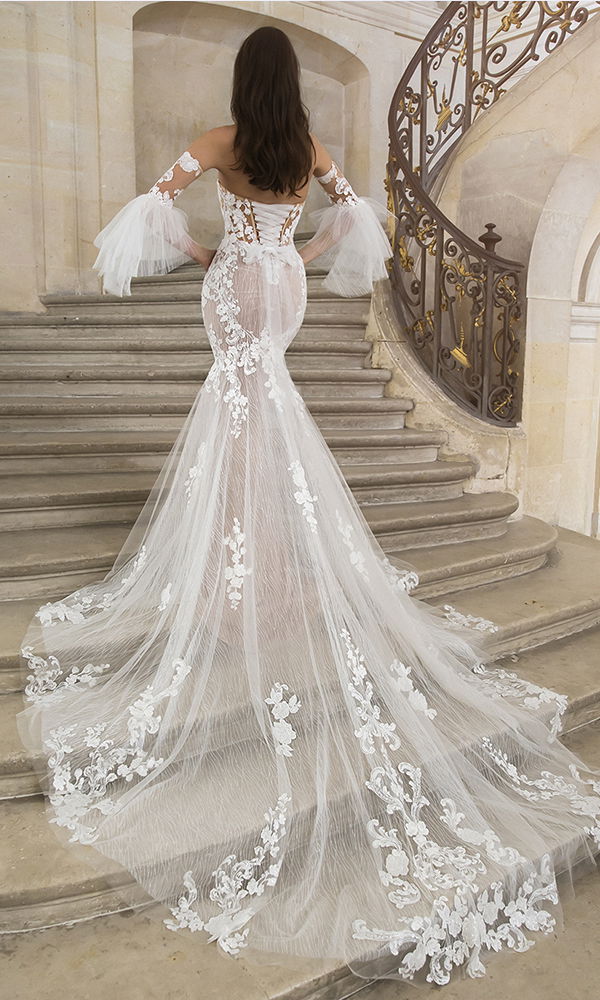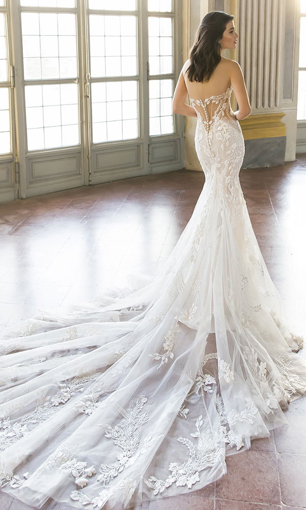 Ravenna heißt dieser Spitzentraum, den es in Weiß und Schwarz gibt. Das gewagte Meerjungfrauenkleid funkelt bei jeder Bewegung. Sensationell und typisch Élysée: die doppelt gelegte Schleppe, die für die perfekte Dosis Drama sorgt.
