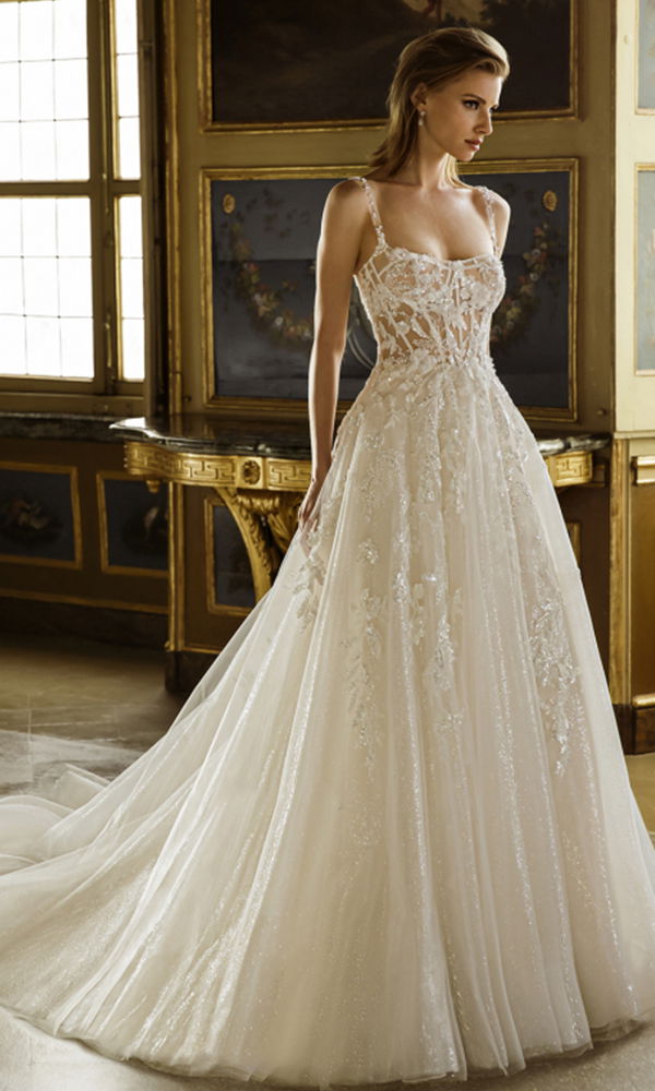Spektakuläre, lineare Spitze findet sich auf dem Style Caroline. Das atemberaubende A-Linien-Kleid präsentiert einen schmeichelhaften U-Ausschnitt mit stützenden Trägern und Illusions-Seitenausschnitten. Die mit kleinen Kristallsteinchen besetzte Spitze fließt in einen Glitzer-Tüllrock über.