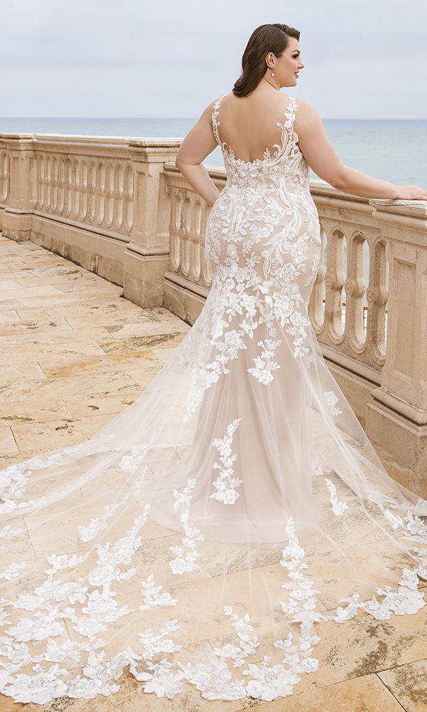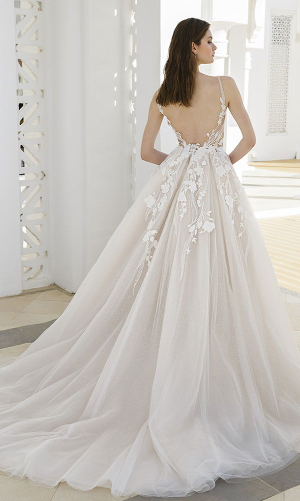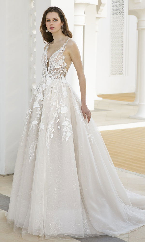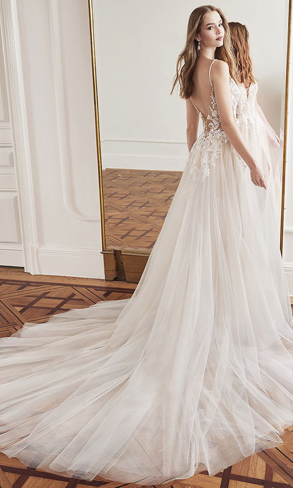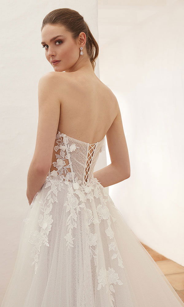 Der subtile, verführerische Look von Modell Carlin überzeugt, dafür sorgt das tiefe Sweetheart-Dekolleté mit freiliegenden Korsagenstäbchen und Illusionsausschnitten. Die 3D-floralen Motive sind entlang der Ausschnitte platziert und münden in einen luftig-leichten Tüllrock.