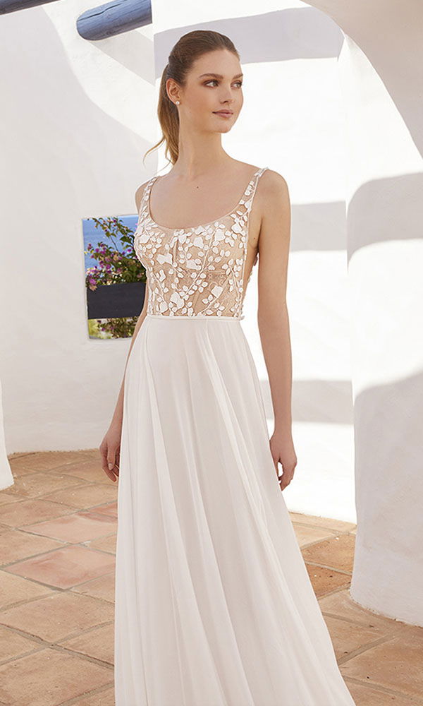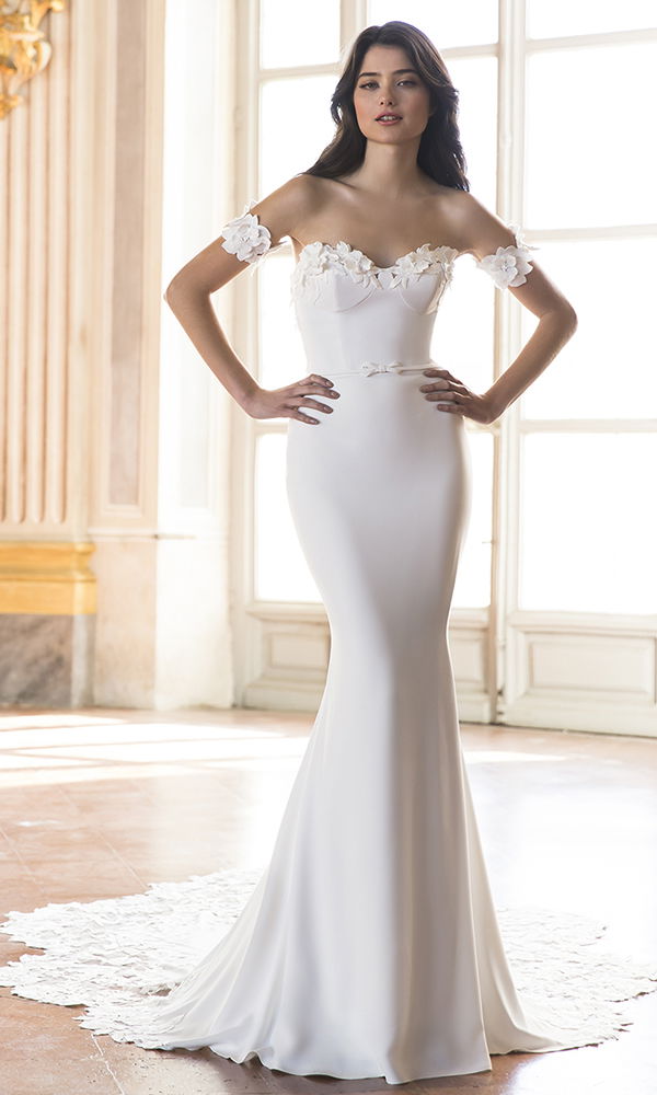 Das Kleid Tina hat eine Meerjungfrauen-Silhouette aus Stretch-Georgette mit handbestickten 3D-Blüten am tiefen Dekolleté und an den abnehmbaren Trägern. Die zarte Schleife an der Taille setzt Akzente und der Illusions-Korsagenrücken mit bestickter Spitze und Knöpfen fügt eine romantische Note hinzu.
