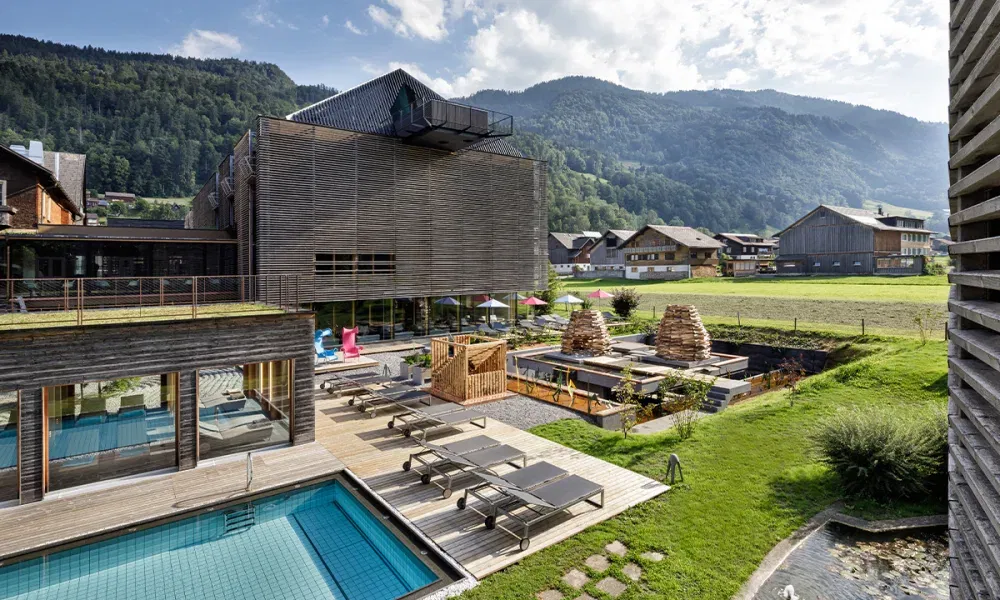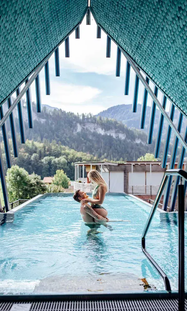 Auch der Wellnessbereich im GAMS Hotel Vorarlberg trägt eine ganz eigene Handschrift: Das sogenannte „Paaradies“-Spa ist ein Refugium nur für Paare. Ob im Onsen-Becken, in der Sauna oder im schwebenden Sky-Pool mit Blick über Bezau – jede Ecke ist auf Ruhe, Nähe und Entspannung ausgerichtet. Paarmassagen bei Kerzenschein runden das Verwöhnprogramm ab. Gäste genießen zudem das Wellness-Paket „Wolke 7 zu zweit“: eine Badezeremonie in mystischem Ambiente mit Abschluss auf dem Rooftop-Sky-Pool, Entspannung im privaten Dampfbad sowie ein Reinigungsritual im Hammam mit anschließender Ruhezeit.