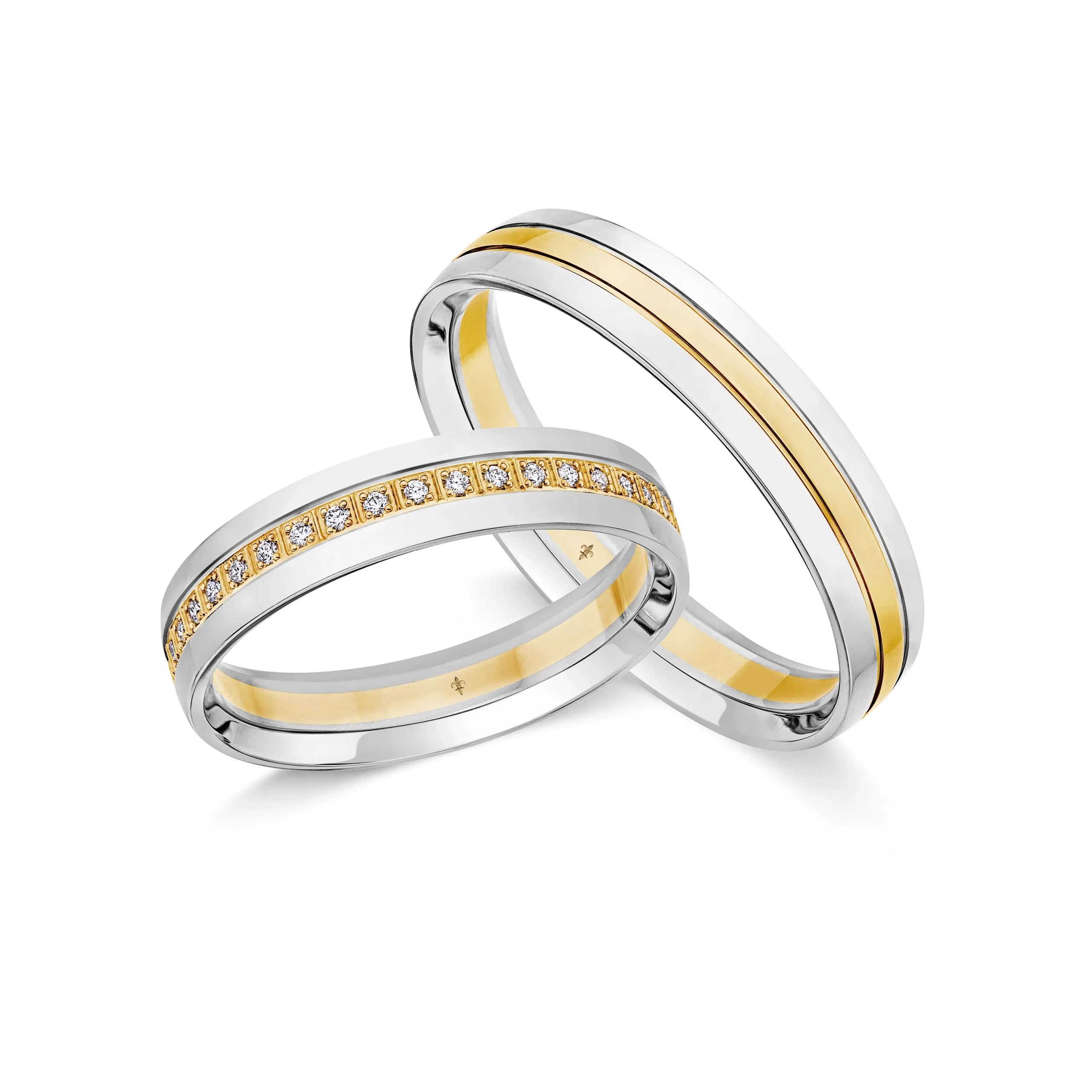 Bild links: Gelbgold trifft auf Weißgold in den Trauringen von GILOY. Auf dem Damenring funkeln Diamanten.