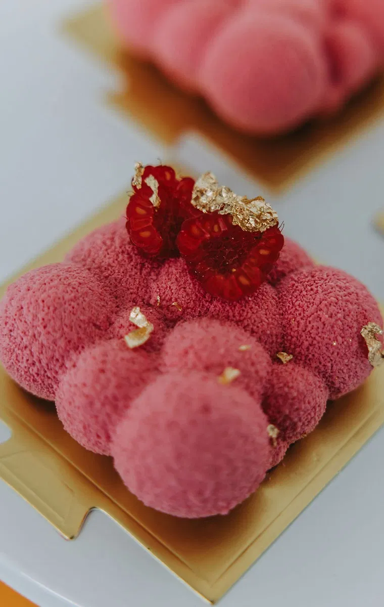 Das fluffige Küchlein mit wolkenartiger Struktur erinnert an eine moderne Skulptur. Leuchtende Farben, samtige Oberflächen und feine Goldverzierungen verbinden Design, Textur und Genuss zu einem eindrucksvollen Statement. Das kunstvolle Dessert ist aber nicht nur zum Anschauen gedacht. Hinter der skulpturalen Form verbirgt sich ein intensives Geschmackserlebnis aus Creme und Biskuit. Genau das macht eine Artsy Wedding aus: Design wird nicht nur betrachtet, sondern gefühlt, geschmeckt und erlebt. Eure Hochzeit wird so zu einem multisensorischen Kunstwerk, das Gästen und euch lange in Erinnerung bleibt.
