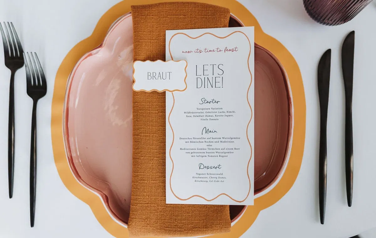 Ein Artsy Table Setting lebt von spannenden Kontrasten und organischen Formen. Farbige Teller mit unregelmäßigen Linien, senfgelbe Stoffservietten und zart getönte Gläser schaffen eine moderne, kreative Atmosphäre. Die Menükarte greift das Design mit verspielten Linien auf und fügt sich harmonisch in das Gesamtbild ein. So wird das gemeinsame Essen nicht nur kulinarisch, sondern auch visuell zum Highlight.