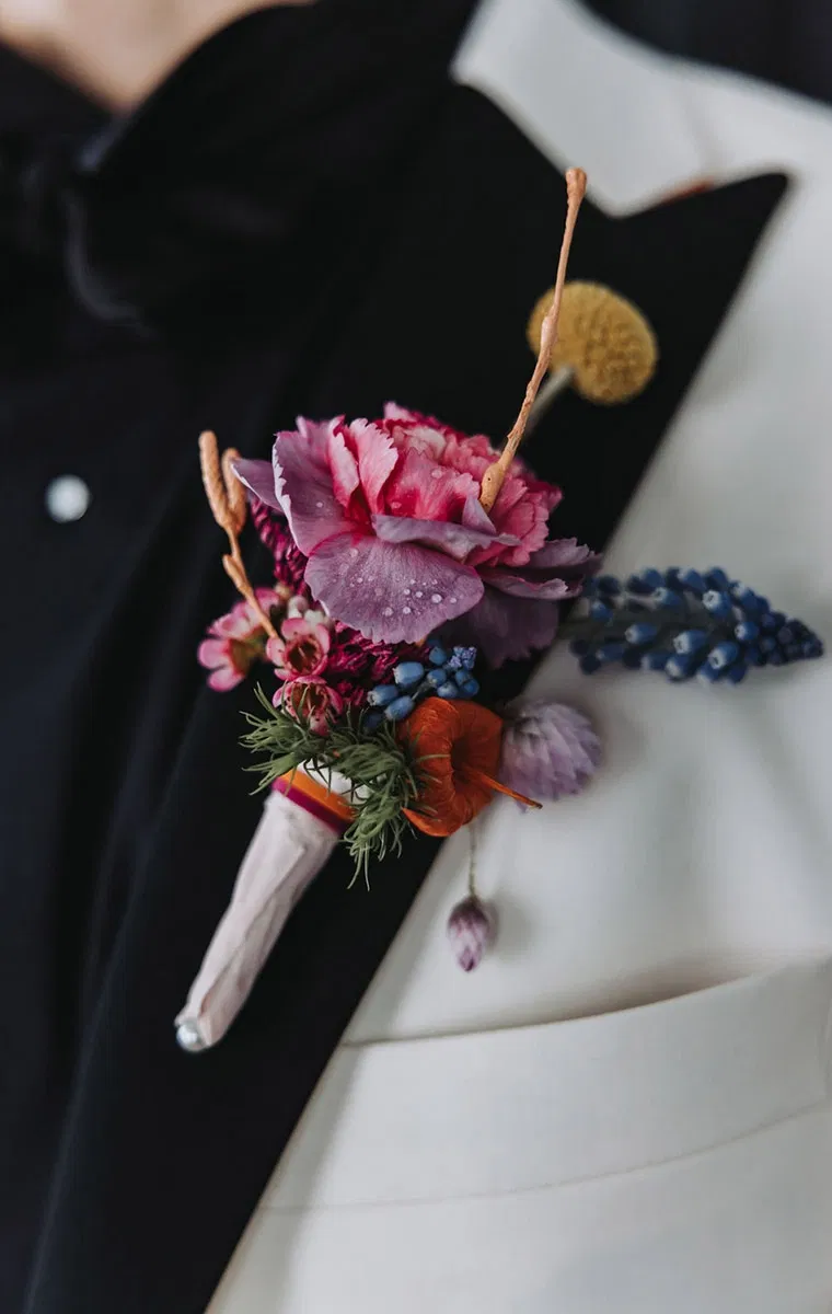Florale Designs dürfen bei einer künstlerischen Hochzeit auffallen. Boutonnieren in kräftigen Pink-, Violett- und Blautönen setzen starke Akzente und erinnern an abstrakte Gemälde. Ungewöhnliche Blütenformen, kreative Kombinationen und bewusst unperfekte Arrangements unterstreichen die kreative Leichtigkeit eures Konzepts und machen florale Details zu echten Hinguckern.