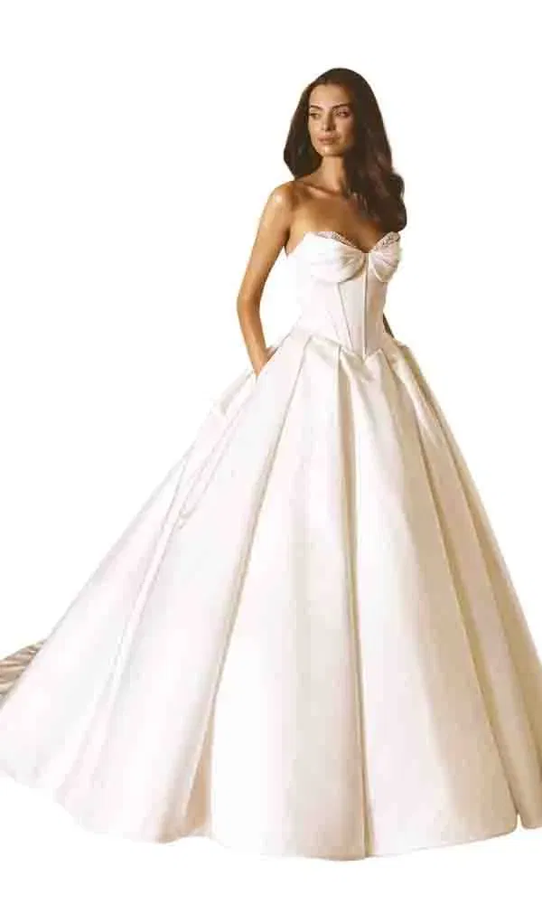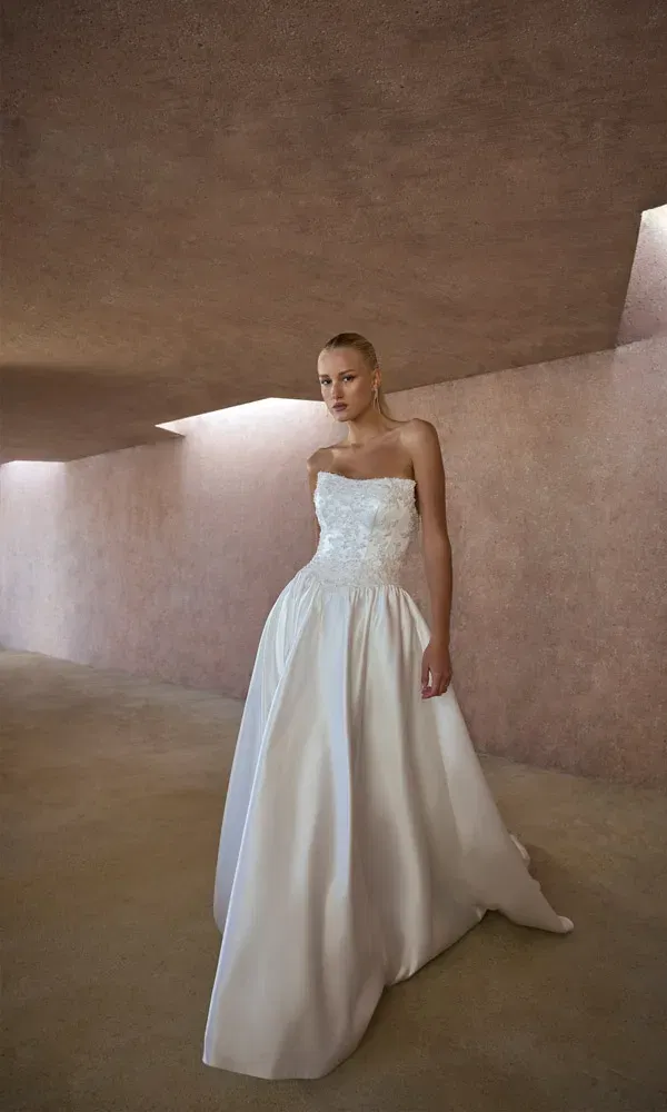 Sichtbare Korsettstäbchen feiern ihr großes Comeback – und sorgen für einen aufregenden Mix aus Sinnlichkeit und Eleganz. In Kombination mit transparenten Oberteilen entsteht ein Look, der selbstbewusst, modern und gleichzeitig romantisch wirkt. Ob in Kombination mit Spitze, funkelnden Perlen oder cleanen Linien: Die sichtbare Struktur betont die Silhouette und verleiht jedem Brautkleid einen Hauch Haute Couture.
