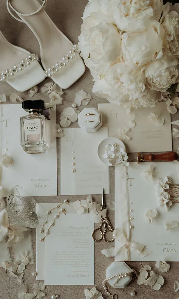 Bei der Hochzeitsdekoration von Clara-Luise und Tobias zog sich ein edles Detail wie ein roter Faden durch das Konzept: Perlen. Ob als Besatz auf dem Tischläufer oder als feine Elemente in der Gesamtgestaltung – sie sorgten für einen Hauch von Eleganz. Goldene Akzente durch Serviettenringe und Platzschilder rundeten das stilvolle Konzept ab, während LED-Kerzen eine warme Atmosphäre schufen. Für einen frischen Farbtupfer sorgten pastellfarbene Blumenarrangements, die jeden Tisch individuell schmückten.