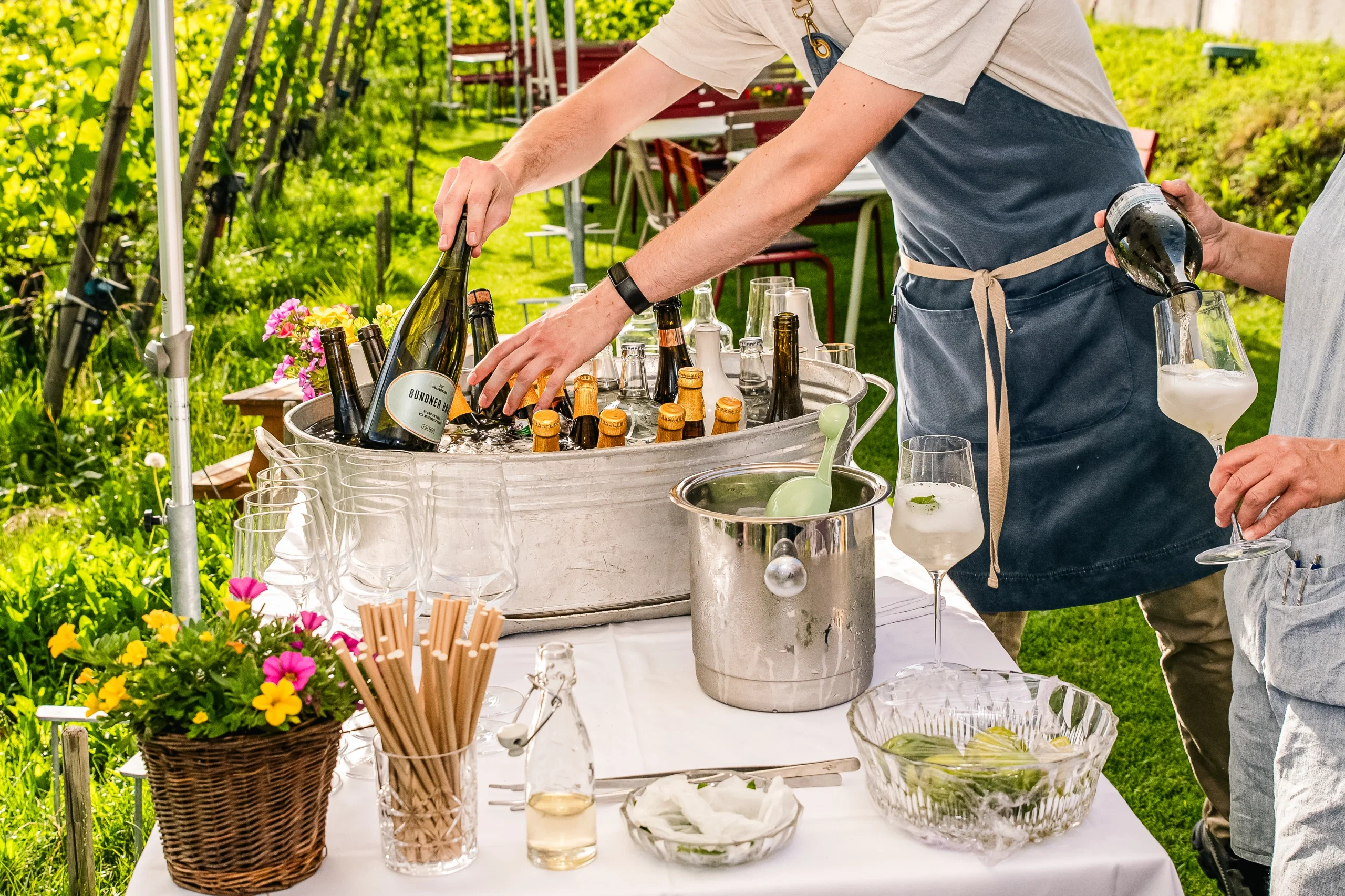 Zwischen den Weinreben wartete ein Überraschungsmoment auf die Gäste: Beim Apéro tauchte ein vermeintlicher Kellner auf. Erst später wurde klar, dass er dort gar nicht arbeitete – trotz perfekter Verkleidung. Stattdessen entpuppte er sich als Comedian. Mit viel Humor erzählte er die Geschichte des Paares, bat einzelne Gäste nach vorne, liess sie kleine Aufgaben erfüllen und eröffnete so auf unvergesslich unterhaltsame Weise das Dinner. Die Idee dazu stammte von der Mutter der Braut und sorgte für eine herrlich lockere, ausgelassene Stimmung. Besonders gut kamen sein typisch schweizerischer Humor und die charmanten Bündner Witze an. Der Comedian: Robert Hälg, auch bekannt als Casper Caduff.