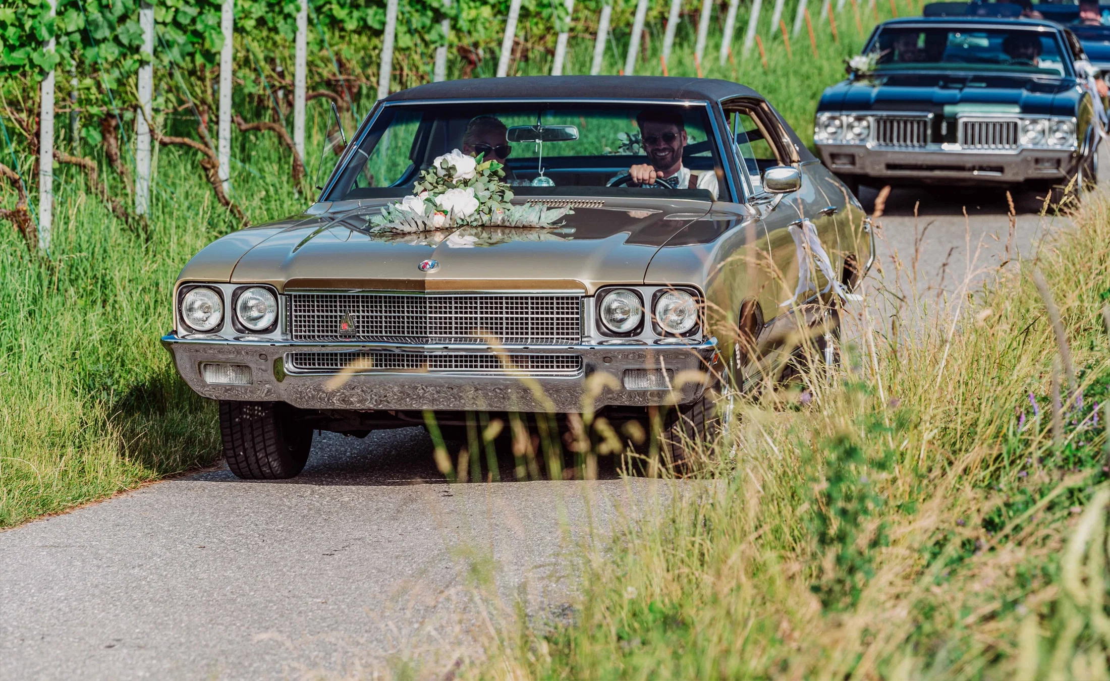 Nach der Zeremonie folgte ein Apéro im Garten, bevor es mit einer Oldtimerfahrt weiterging – organisiert durch Cynthias anderen Cousin. Mit insgesamt sieben Oldtimern machte sich die Hochzeitsgesellschaft als Konvoi auf den Weg in die Bündner Herrschaft. In den Weinbergen, im alten Torkel in Jenins, wurde gemeinsam gegessen und gefeiert. Cynthia und Livio fuhren dabei mit ihrem eigenen goldenen Oldtimer voraus. „Das Fest war stilvoll, festlich und in sich vollkommen stimmig“, sagt Cynthia.