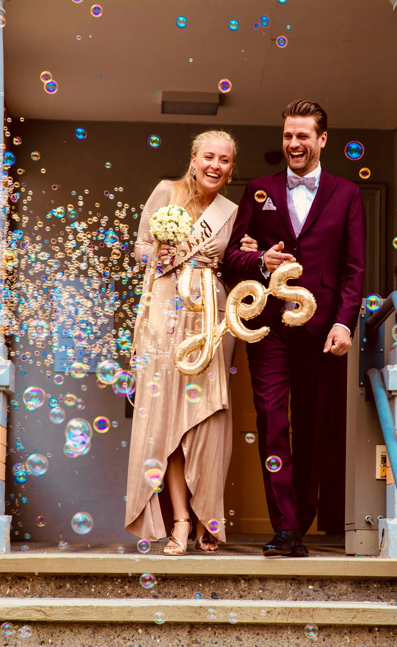 Cynthia trug ein besonderes Outfit aus Hose und Mantel, das von hinten wie ein Kleid wirkte und von vorne an ein cooles 70er-Jahre-Ensemble erinnerte. Livio entschied sich für einen beigen Anzug mit dunkelbraunen Akzenten – dazu eine ausgefallene Fliege.
