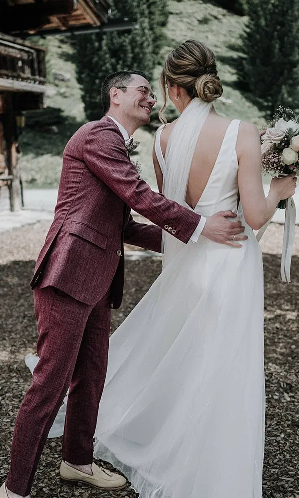 Steffens Hochzeitslook war das Ergebnis eines längeren, sorgfältigen Prozesses. „Ich habe meinen Anzug bei Rooks & Rocks in Berlin anfertigen lassen – komplett maßgeschneidert“, erzählt er. Gemeinsam mit seinem Trauzeugen war er mehrmals dort, um Stoff, Schnitt und Accessoires perfekt abzustimmen. Es ging um jedes Detail – vom Material über die Weste bis hin zur Frage: Fliege oder Krawatte? Am Ende fiel die Wahl auf einen dreiteiligen Anzug in einem warmen Rotton, der wunderbar mit der Bergkulisse und Jils modernem Kleid harmonierte. „Wir wollten etwas, das auffällt, aber trotzdem elegant bleibt – und die Farbe passte einfach perfekt.“ Dazu kombinierte Steffen eine passende Fliege, Weste und ein Einstecktuch, verzichtete bei sommerlichen Temperaturen aber auf Socken. „Ich trug Loafer – das war bequem, stilvoll und passte ideal zum entspannten Look unserer Feier in den Bergen.“