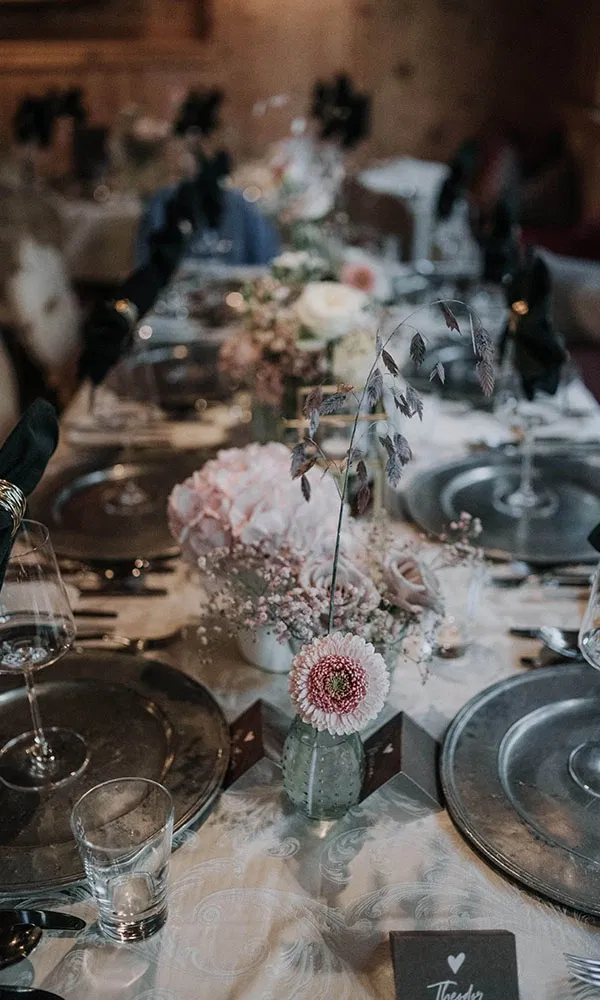 Die Blumenarrangements stammten von der Haus-Floristin des Hotels Bergfried, die das Paar auf Empfehlung der Gastgeberin engagierte. „Uns war wichtig, dass die Blumen zu den Bergen und zum Mai passen“, erzählt Jil. Im Mittelpunkt standen Pfingstrose kombiniert mit Blush- und Rosatönen sowie zarten Akzenten in kräftigerem Pink. „Die Farbpalette harmonierte wunderbar mit der natürlichen Umgebung der Alm“, sagt Steffen. Der Traubogen auf 1.800 Metern wurde üppig geschmückt, dazu kamen ein passender Brautstrauß, Anstecker für Steffen und den Trauzeugen sowie Blumenarmbänder für Trauzeugin und Rednerin. Selbst die Kinder bekamen kleine Blumendetails: Haarkränze und Mini-Anstecker.