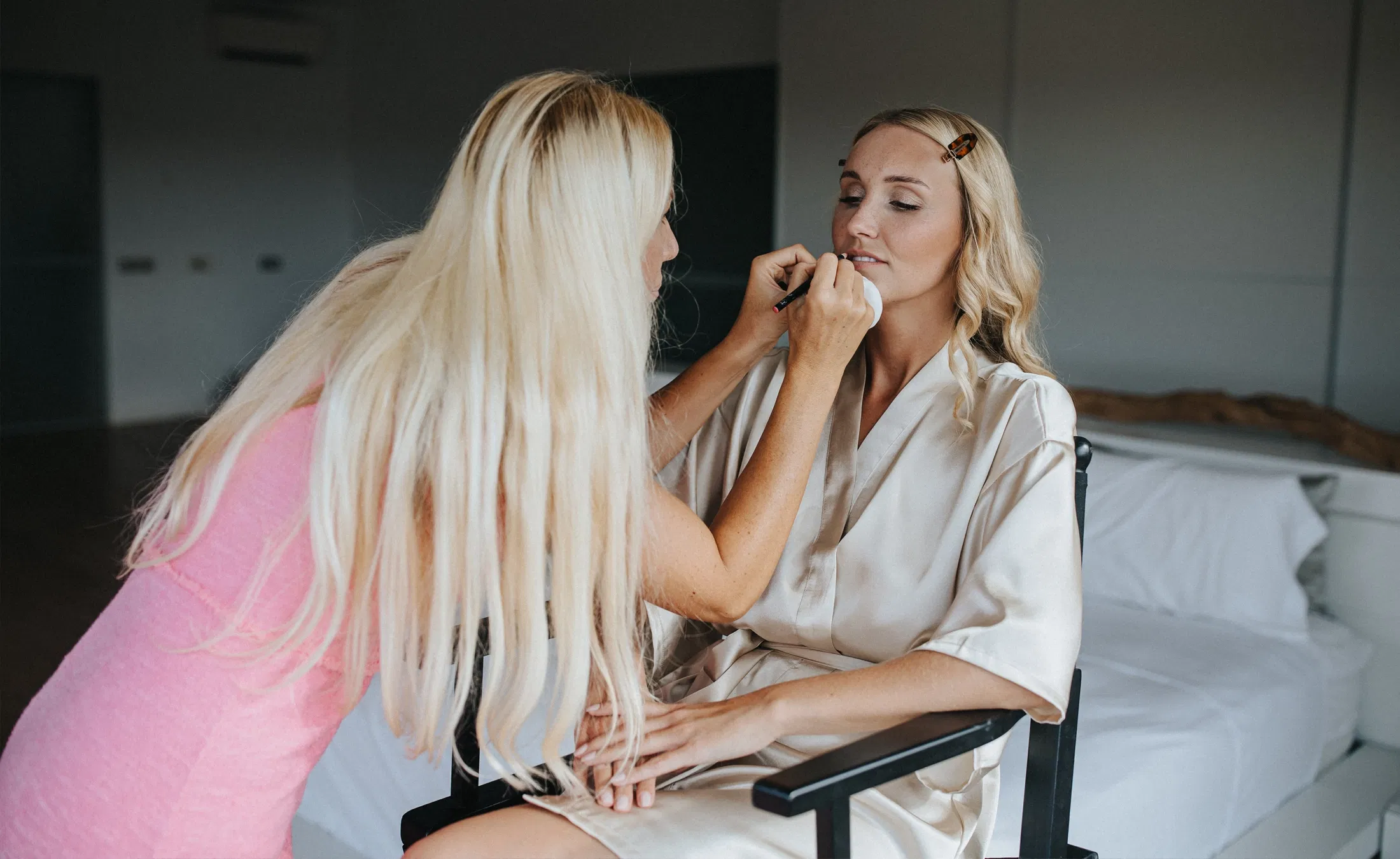 Make-up-Artistin trägt einer Braut beim Getting Ready Lippenstift auf – ein natürlicher Brautlook entsteht.