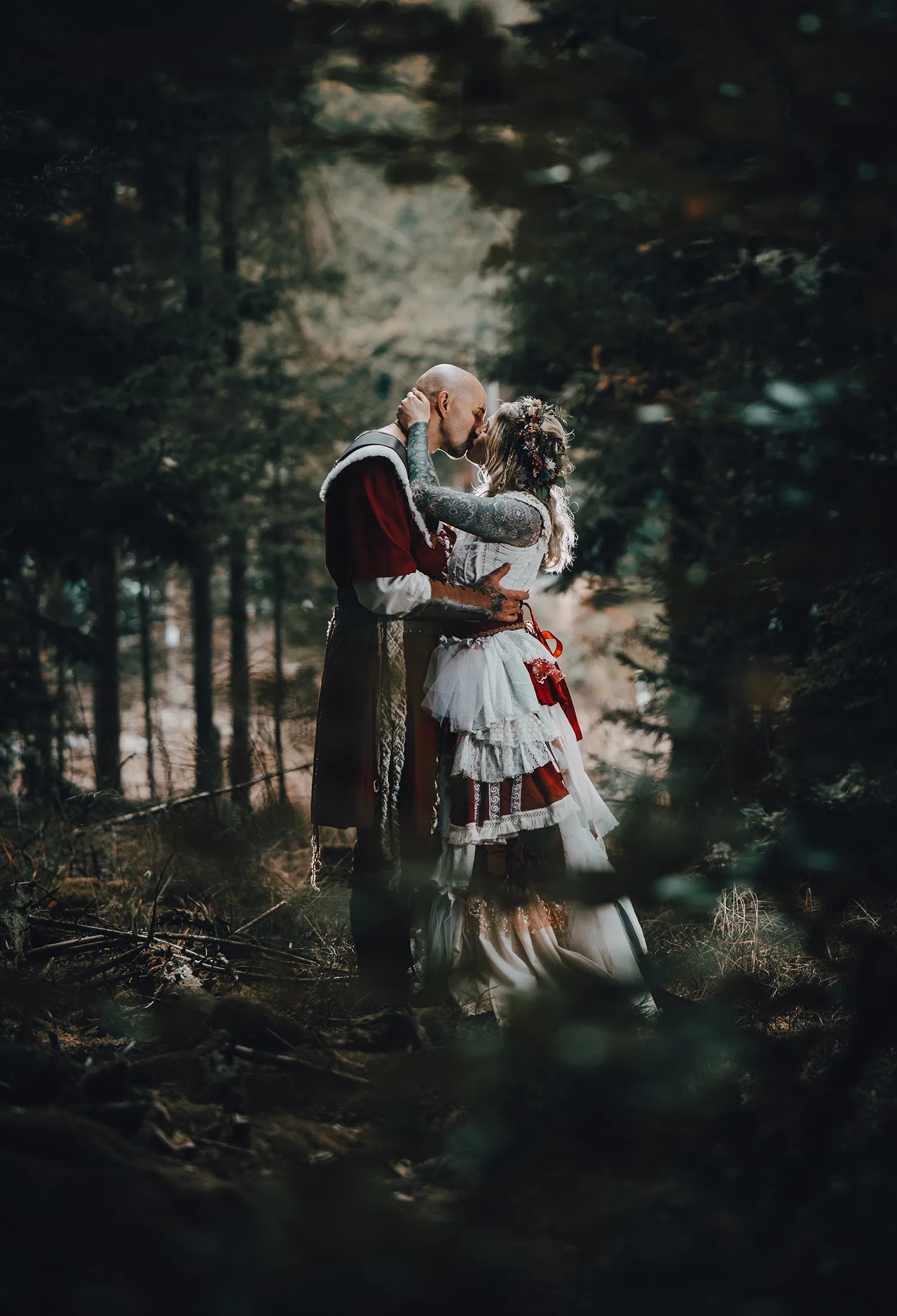 Spiele, gemeinsames Anstoßen mit Hörnern oder das Erzählen von Geschichten machen den Abend lebendig. Ein Paarshooting im Wald bei gedämpftem Licht bildet den emotionalen Höhepunkt. Zwischen hohen Bäumen entstehen Bilder voller Mystik, Intimität und nordischer Magie.