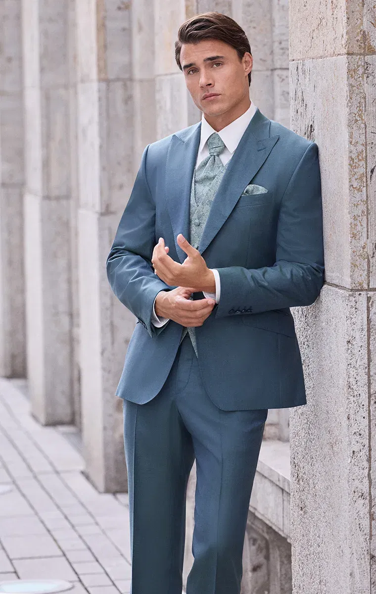 Dieser Look vereint Frische und Eleganz. Der hellblaue Anzug mit gemusterter Weste und passendem Einstecktuch wirkt leicht und modern – ideal für Frühlings- und Sommerhochzeiten. Die Kombination aus kühlem Farbton und klassischem Schnitt sorgt für einen gepflegten, aber entspannten Auftritt.