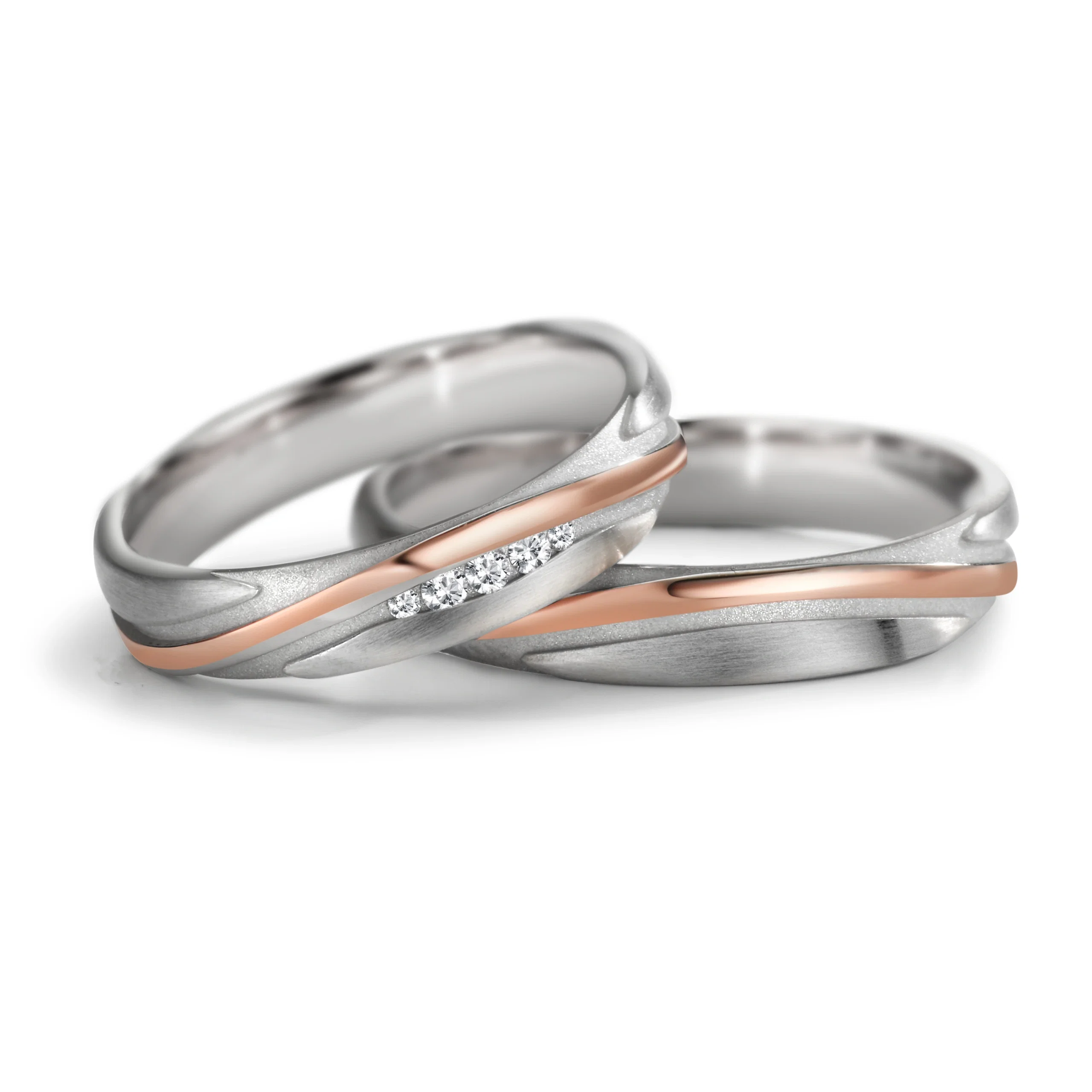 Markantes Trauringpaar mit schwungvoller Wellenlinie aus Roségold und einer Kombination aus mattiertem und poliertem Weissgold. Auf dem Damenring blitzen fünf Brillanten.