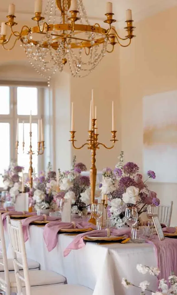 Fein aufeinander abgestimmte Details machen die Tafel zum Erlebnis: Goldene, hohe Kerzenleuchter, zarte Tischläufer in Lavendeltönen, edles Porzellan mit Goldrand und Blumengestecke in Flieder und Creme. So entsteht eine märchenhafte Kulisse für euer Festessen.