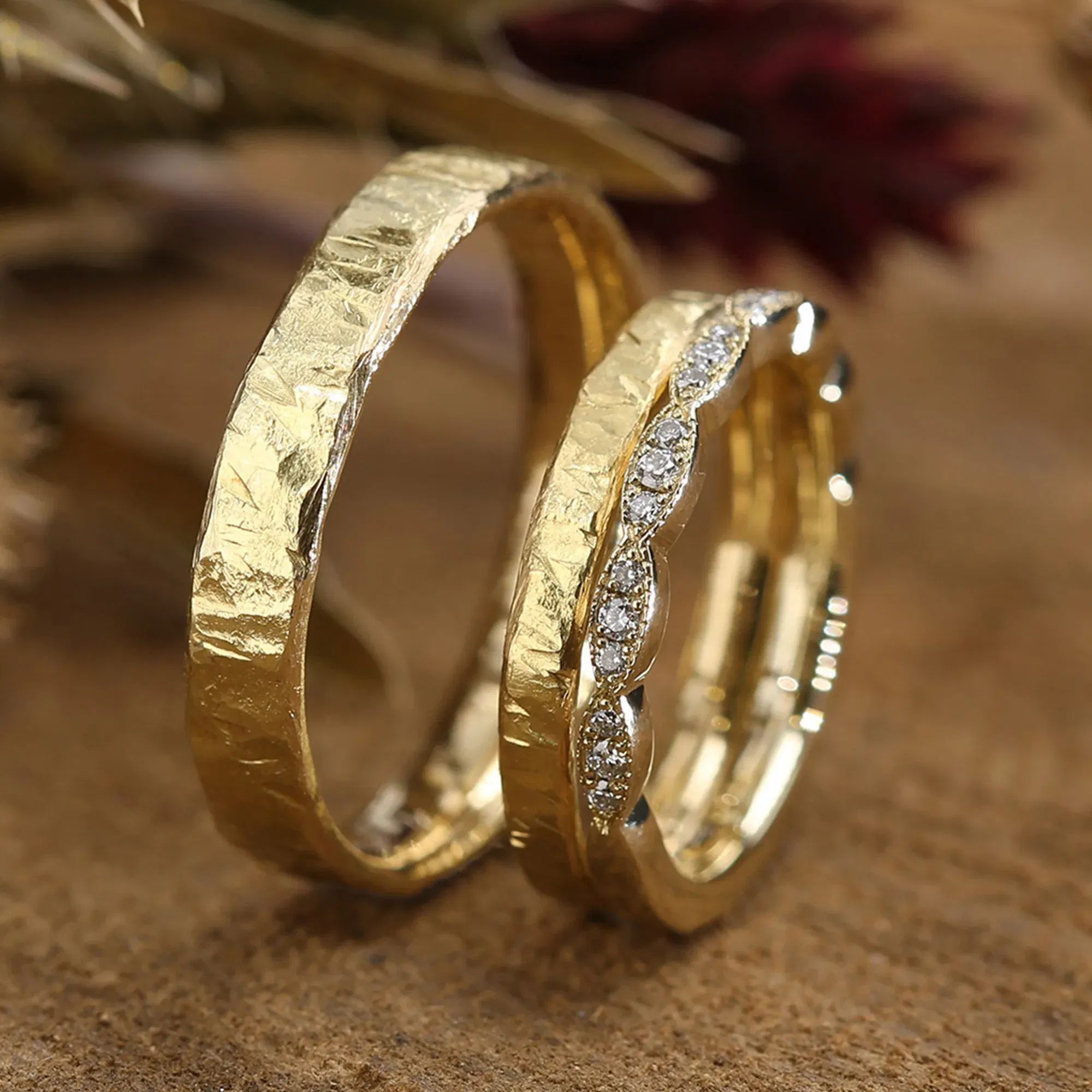 Diese Eheringe verbinden traditionelles Handwerk und modernen Stil. Der Tantal-Herrenring beeindruckt mit einem Kristall-Hammerschlag, der Gelbgold-Damenring vereint mit filigraner Kordel im Vintage-Look. Der perfekte Ausdruck ewiger Liebe.