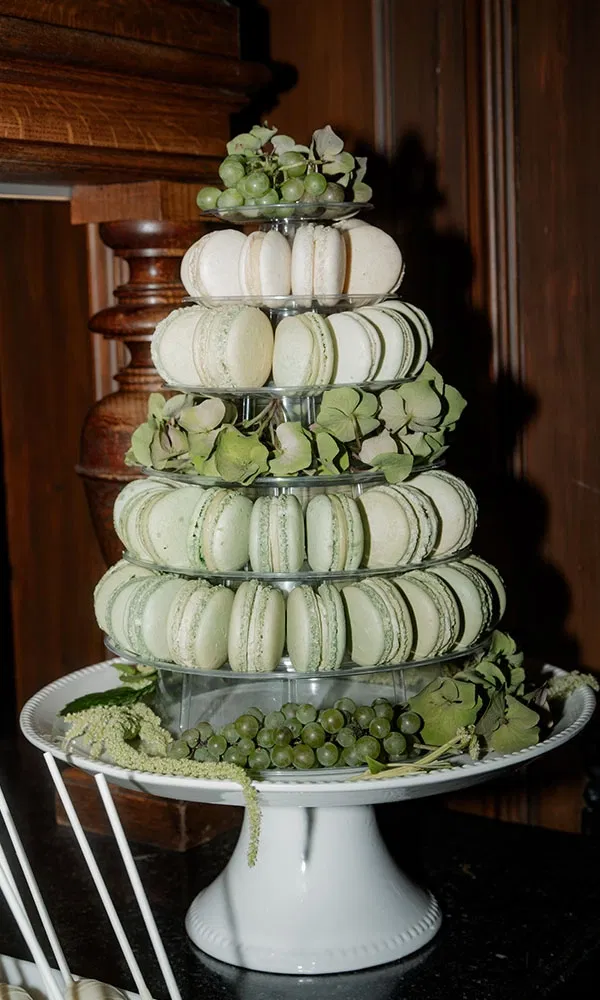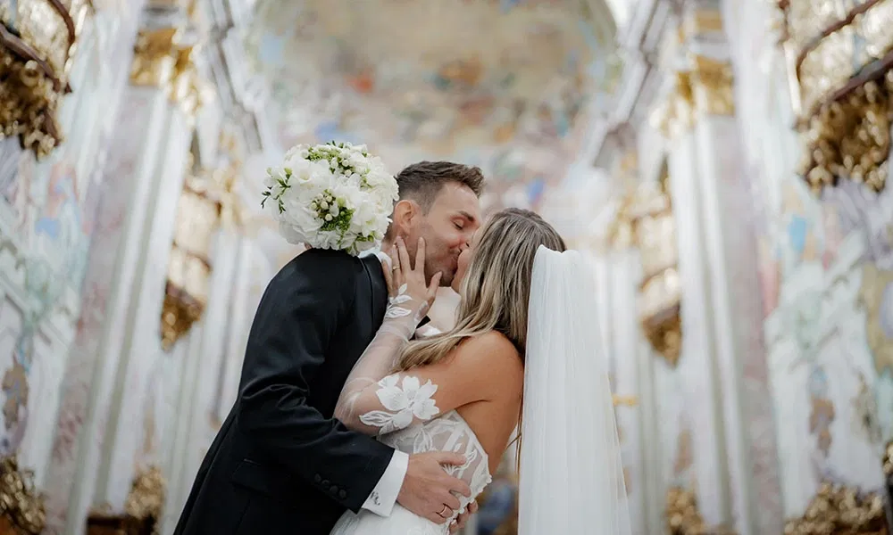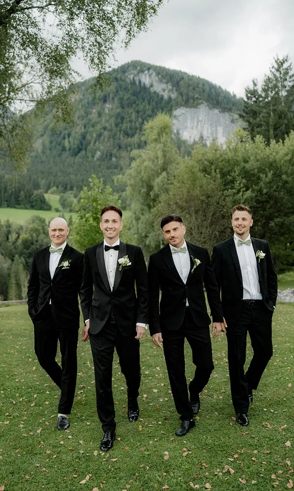 Evelyn und Lukas entschieden sich für den Stil Old Money, inspiriert von klassischen Villenhochzeiten mit vielen Vintage-Elementen. Ein besonderes Detail waren die maßgefertigten Vintage-Säulen, die Evelyns Onkel in seiner Tischlerei Jakob eigens für die Hochzeit anfertigte – echte Unikate, die das Konzept perfekt widerspiegelten. Darauf arrangierte Dekoration wie römische und böhmische Vasen sorgte für ein edles, zeitloses Ambiente. Das Farbkonzept war in Sage Green gehalten. Die Brautjungfern trugen Kleider in Dusty Sage und die Männer waren mit passenden Fliegen auf das Farbschema abgestimmt. Lukas trug zur kirchlichen Trauung einen schwarzen Smoking und wechselte am Abend für die Party in ein weißes Sakko. Ein weiteres Highlight war der Jaguar-Oldtimer von KFZ Oberleitner, der den Old-Money-Stil ideal ergänzte. Das Auto gehört Evelyns Patenonkel, der sie gemeinsam mit ihrem Papa zur Kirche fuhr – ein Moment, den sie nie vergessen wird.