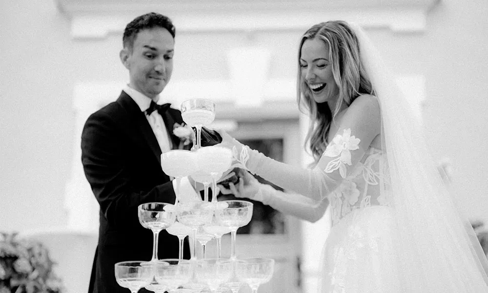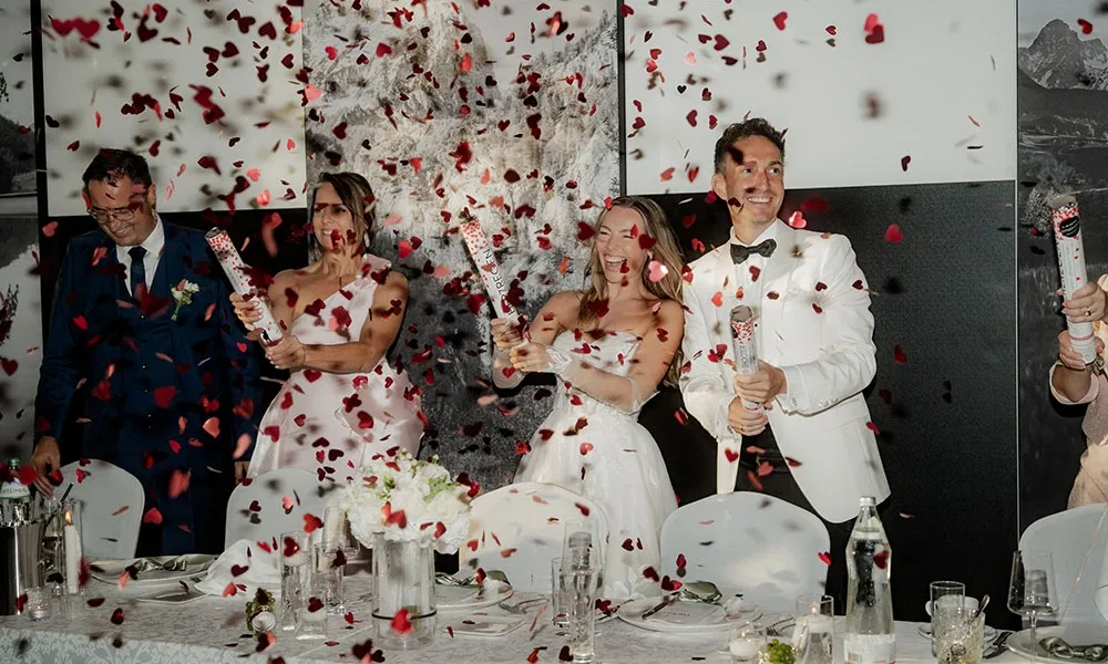 „Da ich aus dem Marketing komme, habe ich fast alles selbst gemacht“, erzählt Evelyn. „Von den Menükarten, die ich selbst designt, gedruckt und gestanzt habe, über die Einladungen bis hin zu den Gastgeschenken.“ Diese waren etwas ganz Besonderes: Jedes Geschenk war mit einer persönlichen Nachricht versehen. „Wir hatten für jeden Hochzeitsgast ein Polaroid-Foto. Auf der Rückseite stand eine persönliche Botschaft“, erzählt sie. „Bei meinen Verwandten waren es oft Bilder aus der Kindheit, bei Freunden Erinnerungen aus den vergangenen Jahren. So hatte jeder Gast ein kleines Stück gemeinsame Geschichte in der Hand.“ Als humorvolles Extra gab es außerdem ein Hangover-Care-Paket – mit Augentropfen, Aspirin und allem, was man nach einer langen Partynacht brauchen könnte.