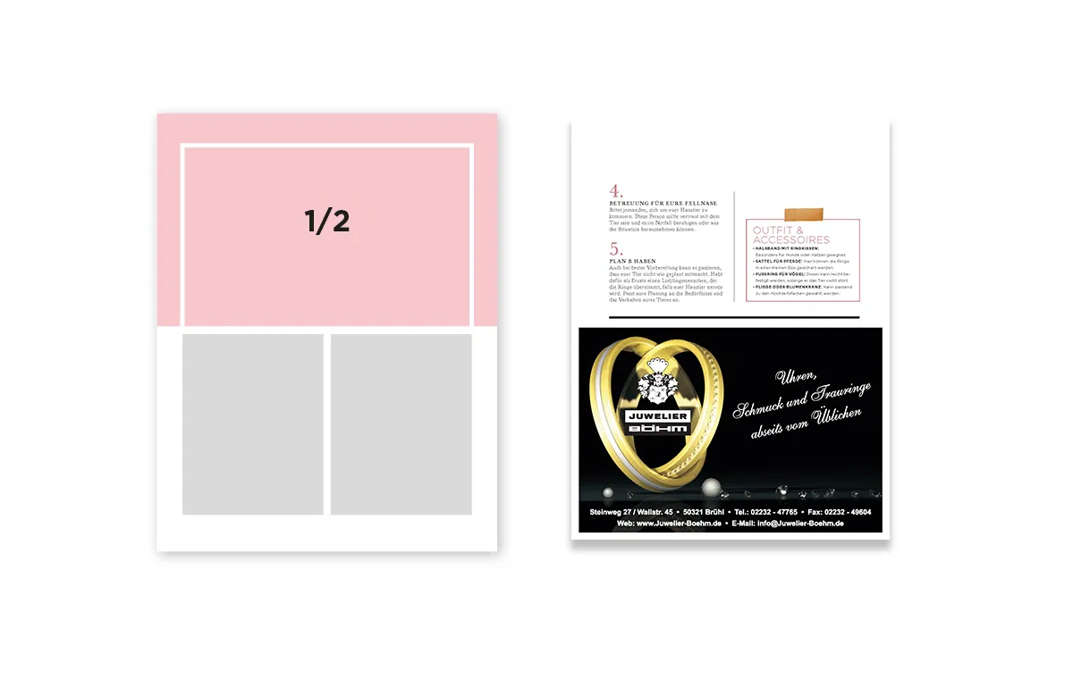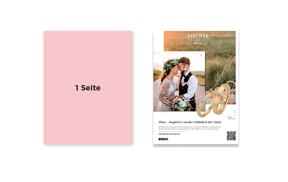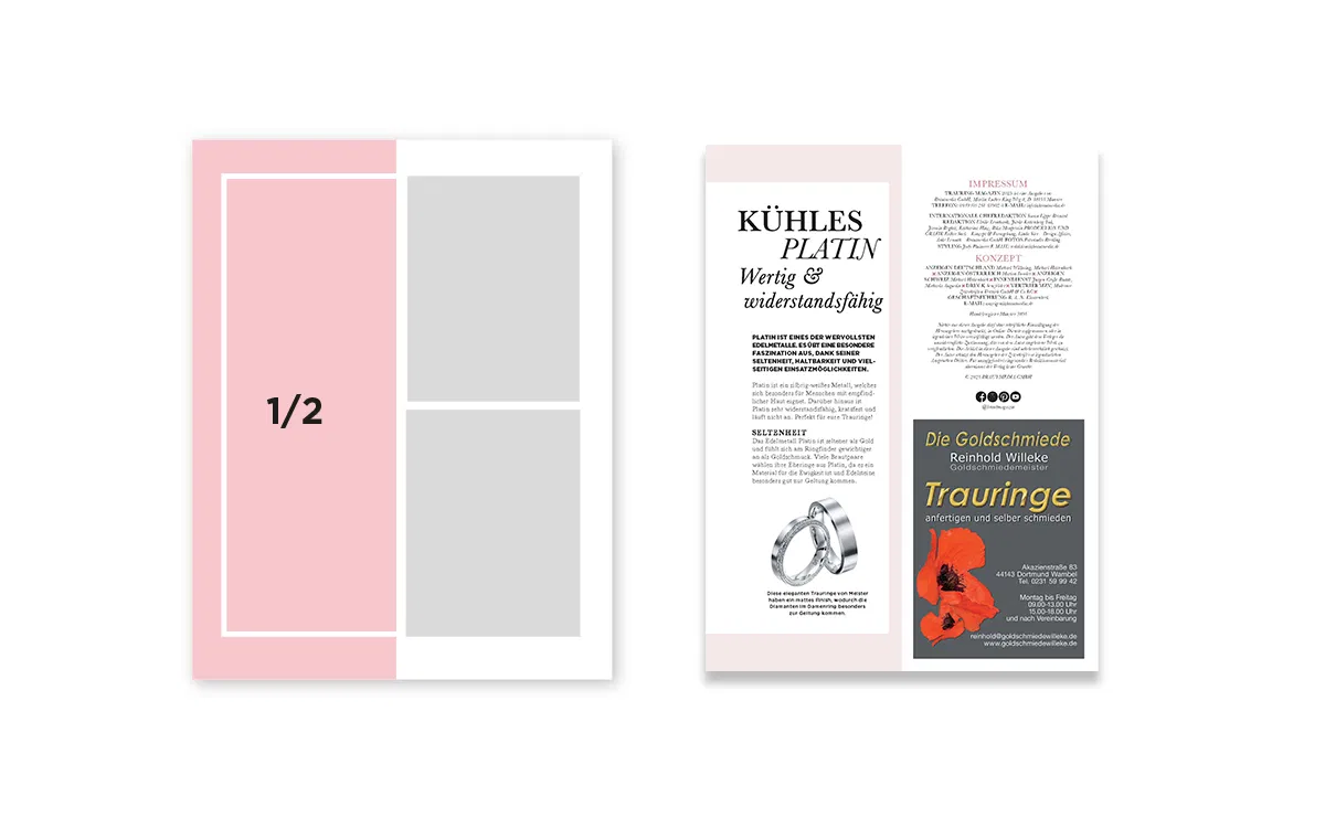 Unsere hochwertigen Print-Anzeigenformate im Trauring Magazin bieten Ihnen die ideale Bühne, um Ihre Trauring-Kollektionen, Ihre handwerkliche Expertise und Ihre Designwelt wirkungsvoll zu präsentieren. Ihre Anzeige ist harmonisch in das redaktionelle Umfeld integriert, das Orientierung bietet, Vertrauen aufbaut und Hochzeitspaare in ihrer Inspirationsphase begleitet.